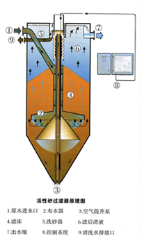 开云app登录入口采用逆流原理,污水由设备上部进入分配管并由安装在设备底部的分水器分水,向上流经滤床而被过滤,然后由开云app登录入口上部的滤液出水口流出。被滤砂截留的杂质和滤砂一起从设备锥形底部经滤料提升装置提升至设备顶部的洗砂器内。砂的清洗从被滤料提升装置提升时就开始,在紊流作用下使杂质从砂粒中分离出来。杂质随洗砂水经污水排放口排放,清洗后的砂颗粒(密度高)自由沉降到砂床上。实现水的净化与砂的清洗同时进行的连续过滤过程。